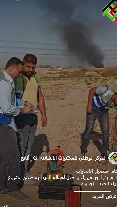 يواصل فريق شعبة الجيوفيزياء في قسم تحريات التربة أعماله الميدانية ضمن مشروع مدينة الصدر الجديدة