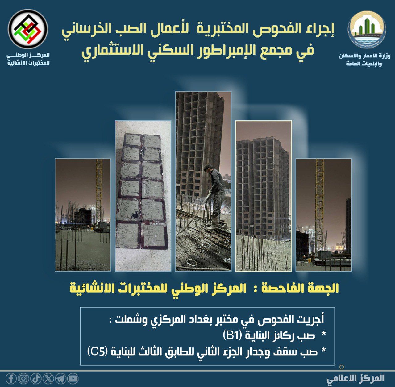 اجراء الفحوص المختبرية لاعمال الصب الخرساني في مجمع الامبراطور السكني الاستثماري