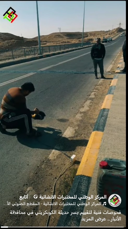 وضمن مهام المركز الوطني للمختبرات الإنشائية في متابعة وتقييم سلامة المنشآت الحيوية، أجرى فريق فني متخصص من شعبة التقويم الإنشائي سلسلة من الفحوصات الموقعية والمختبرية للفضاء رقم (20) من جسر حديثة الكونكريتي في محافظة الأنبار بهدف تقييم الحالة الإنشائية للجسر.