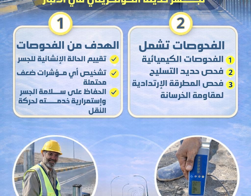 (861) فحصاً للخرسانة للتحقق من متانتها وكفاءتها. و(44) فحصاً في قطاع الطرق، فضلاً عن (246) فحصاً كيميائياً لتحليل المواد وضمان صلاحيتها للاستخدام.