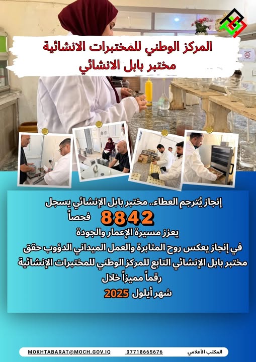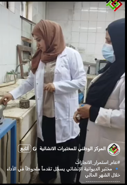 مختبر الديوانية الإنشائي يسجّل تقدماً ملحوظاً في الأداء خلال الشهر الحالي